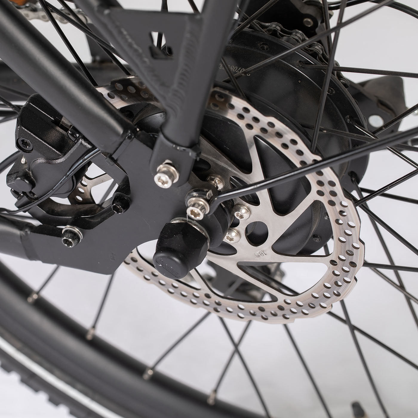 De Aitour Cargo Bike - Starter heeft hydraulische schijfremmen met een veiligheidsparkeerfunctie waarmee u uw bakfiets snel, voorzichtig en veilig kunt stoppen wanneer deze volledig is beladen door lichte druk op de remhendel.